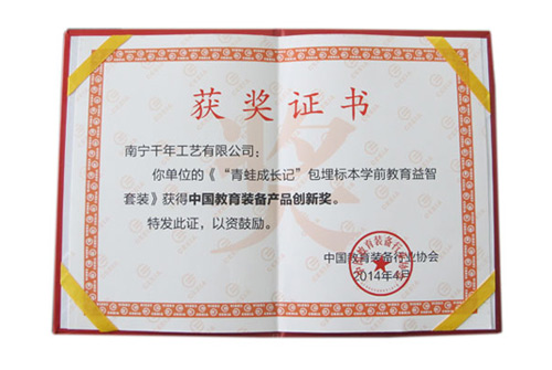 由南寧千帆教學科技有限公司設計,聯(lián)合南寧千年工藝有限公司共同研發(fā)的“千帆”品牌包埋標本學前教育益智產(chǎn)品--《青蛙成長記》,榮獲中國教育裝備產(chǎn)品創(chuàng)新獎。產(chǎn)品在設計上大膽創(chuàng)新,引入“與孩子共享自然”的教育理念,得到評審專家的一致認可。